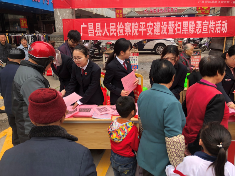 为推进扫黑除恶专项斗争扎实开展,不断提高辖区群众参与活动的积极性,营造全民参与扫黑除恶专项斗争的浓厚社会氛围,3月30日上午,广昌县人民检察院、广昌县司法局、广昌县公安局旴江镇分局、旴江镇司法所在广昌县白莲市场开展平安建设暨扫黑除恶普法宣传活动。