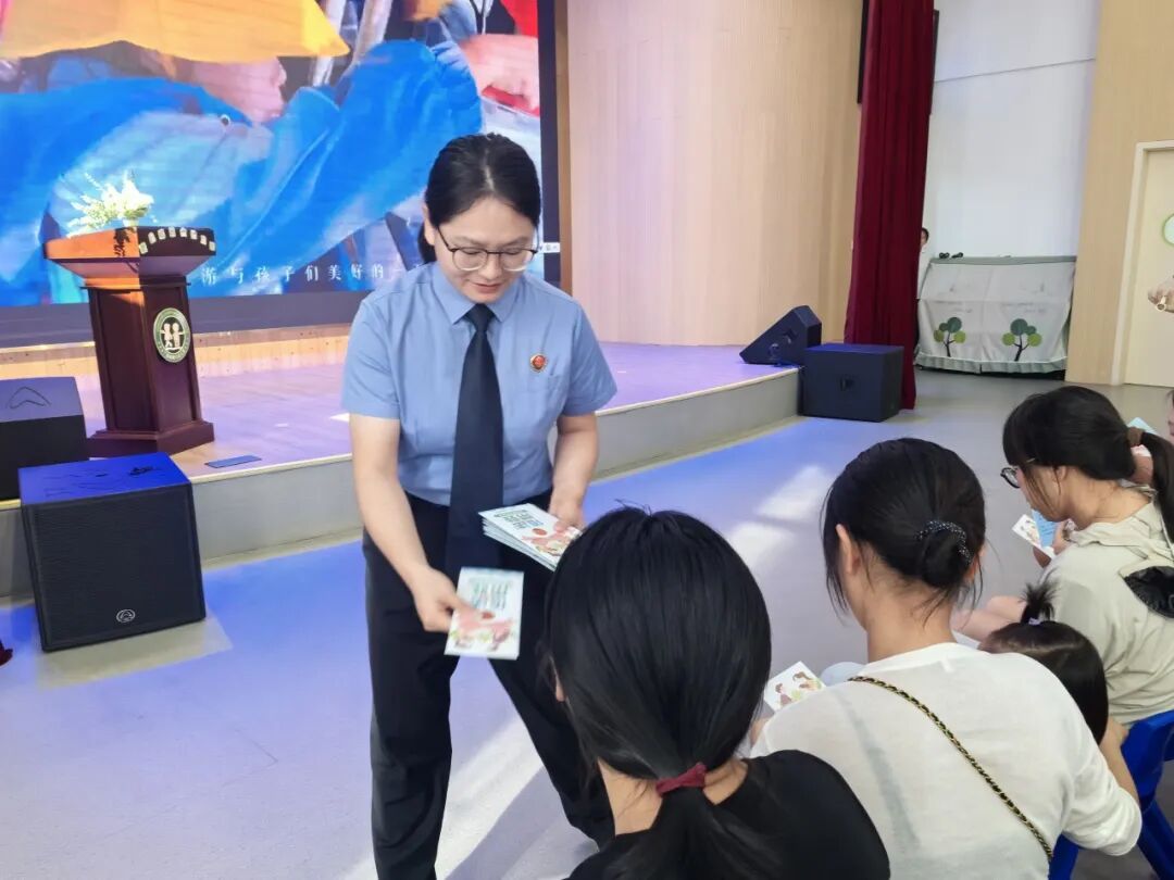在家庭教育方面,检察干警结合发放的“依法带娃”法治宣传手册内容,从家庭教育的特点、原则出发,为家长们提供了实用的教育建议。指出家长应尊重儿童、与孩子共同成长,注重亲子关系的培养。建议家长把握和孩子相处尺度,帮助孩子树立正确的价值观和行为准则。